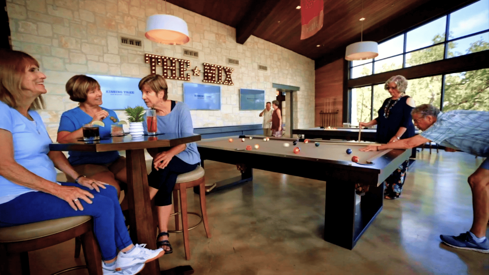 Our beautiful community building is the hub of social life here at Kissing Tree. Grab a drink with new friends, enjoy live music, play a game of pool or shuffleboard, or just relax in one of the many lounge areas.