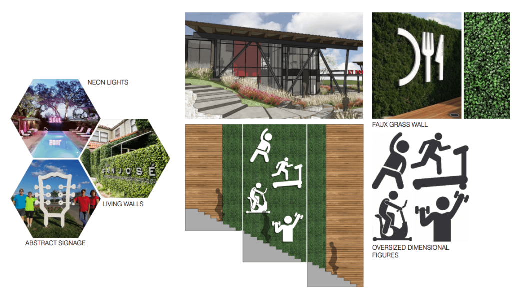 We drew on nostalgia for some of the project’s abstract design elements such as oversized dimensional figures doing activities like swimming and working out.
