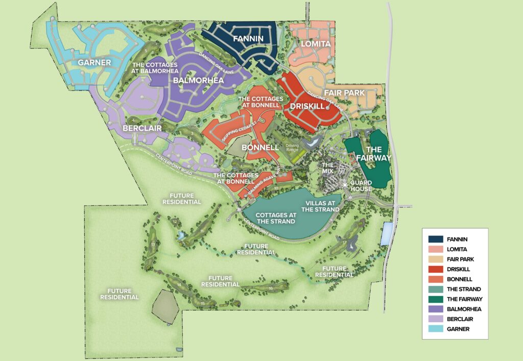 The Strand: Named for the historic Galveston neighborhood next to the waterfront, The Strand is located on the south side of Kissing Tree close to The Mix. This section features Cottage and Villa homes.